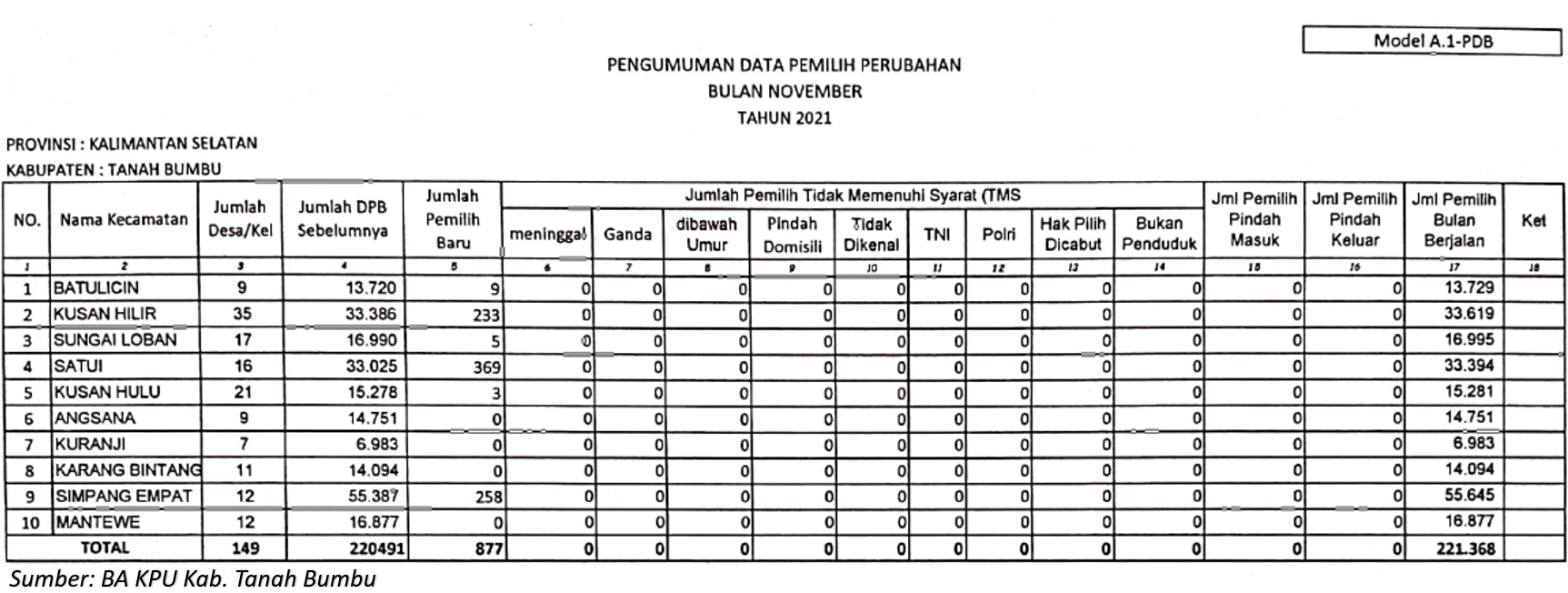 KPU Kabupaten Tanah Bumbu, pada Sabtu 4 Desember 2021 mengadakan Rapat Koordinasi Daftar Pemilih Berkelanjutan yang dihadiri oleh perwakilan dari Partai Politik, Bawaslu, dan Dinas Kependudukan dan Catatan Sipil Kabupaten Tanah Bumbu.